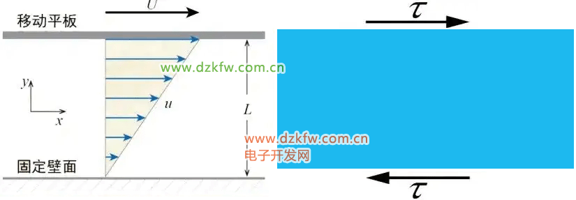 粘性在宏觀上表現為流體之間的動摩擦力。這是牛頓研究粘性的實驗,兩壁面之間充滿流體,向右拉動上壁面運動,流體就會形成一種如圖所示的分層流動。取流體中的一塊矩形區域來分析。很顯然,方塊上表面受向右的切應力,下表面受向左的切應力。牛頓的結論是,這個切應力與速度梯度稱正比: , 可以表示變形率,這樣就得到粘性力與流動的關系,這個關系就是牛頓粘性定律, 是粘性系數,代表流體粘性的大小。根據流體是否滿足牛頓粘性定律,流體分為牛頓流體與非牛頓流體(如糖漿、血液)。